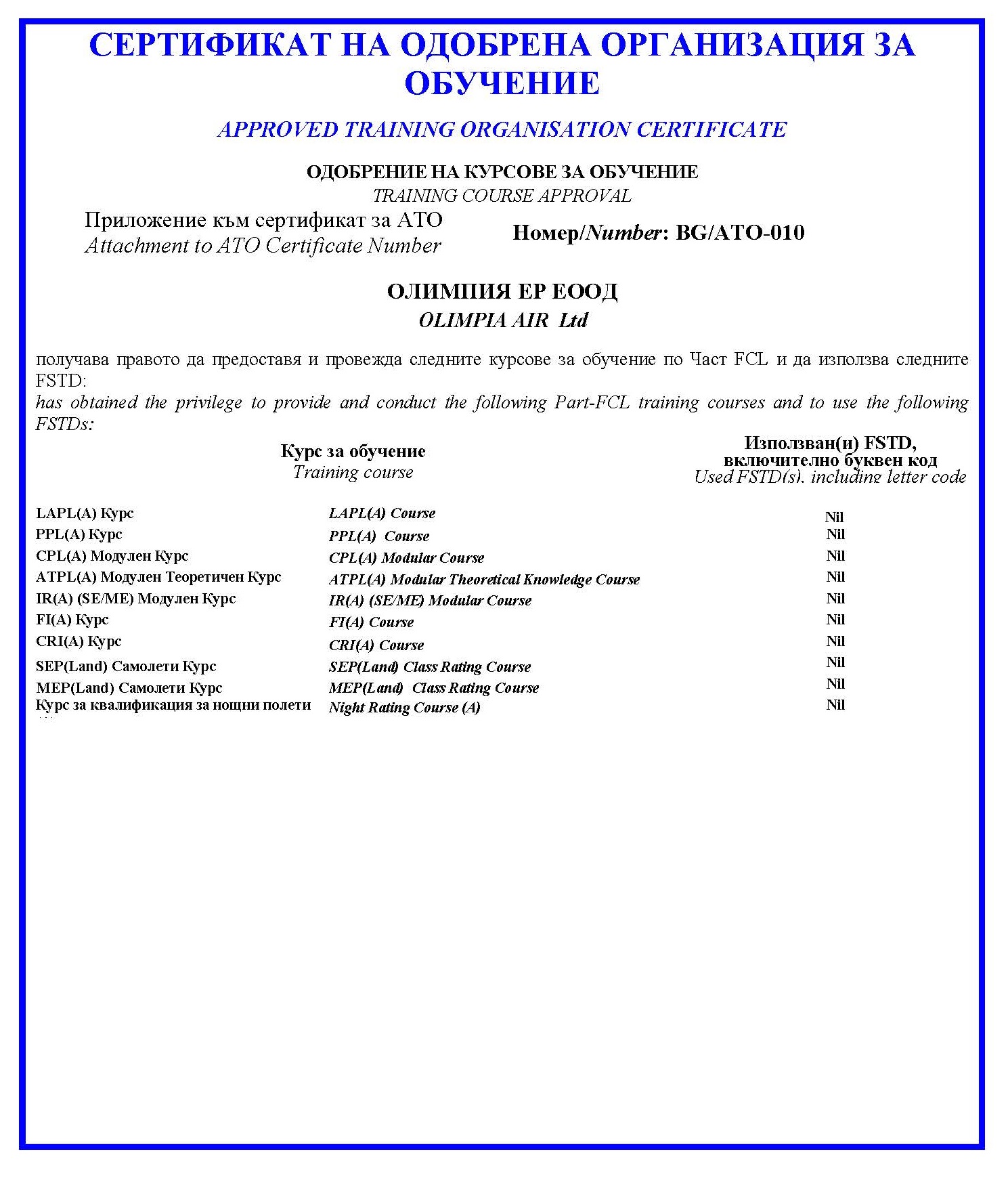 Flight School Olimpia Air is Certified Pilot Training Organisation by the Bulgarian Civil Aviation Authorities. The main activity of Olimpia Air is to train pilots for Civil Aviation, according requirements of the European Aviation Safety Agency.